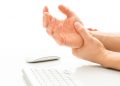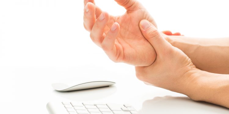 Working too much - suffering from a Carpal tunnel syndrome - young man holding his wrist in pain due to prolonged use of keyboard and mouse over white background (color toned image; shallow DOF)